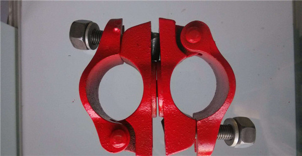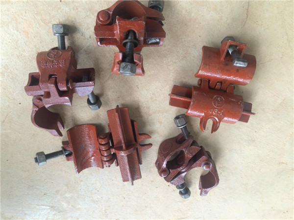 建筑扣件屬于建筑機械零件領域。本建筑扣件由兩個分扣件組成,每個分扣件中的下扣件小端與活節(jié)螺栓連接,大端與帶有豁口和止推面的上扣件連接,兩個分扣件之間碾鉚連接,并以任意角度旋轉(zhuǎn)。